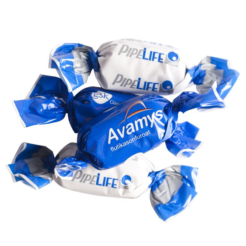 Paperi: valittavana valkoinen tai hopeanvärinen tai läpinäkyvä paperi. Sama painolaatta kuin toffeen, kermakaramellien ja karamellien painatuksissa.