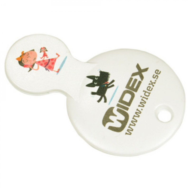 Monien mahdollisuuksien ostoskärrypoletti. Pehmeälinjainen ja oteystävällinen poletti, jonka suuressa "kädensijassa" on runsaasti tilaa logolle ja mainosviestille. Saatavana 10 SEK ja nyt myös 1 e. Valkoinen. Mitat: 57 x 33 mm. Painoalue määritellään aiheen mukaan.