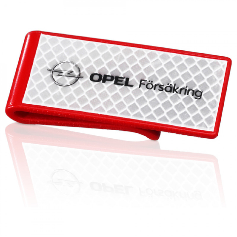 Kätevä klipsi, joka kiinnittyy vaivatta takin hihaan, taskuun tai selkäpuolelle - mahdollisuuksia on monia. Heijastaa valoa erittäin hyvin. Saatavana sinisenä, punasena, mustana tai valkoisena. Mitat: 79 x 33 mm. Max painoalue: 67 x 27 mm.