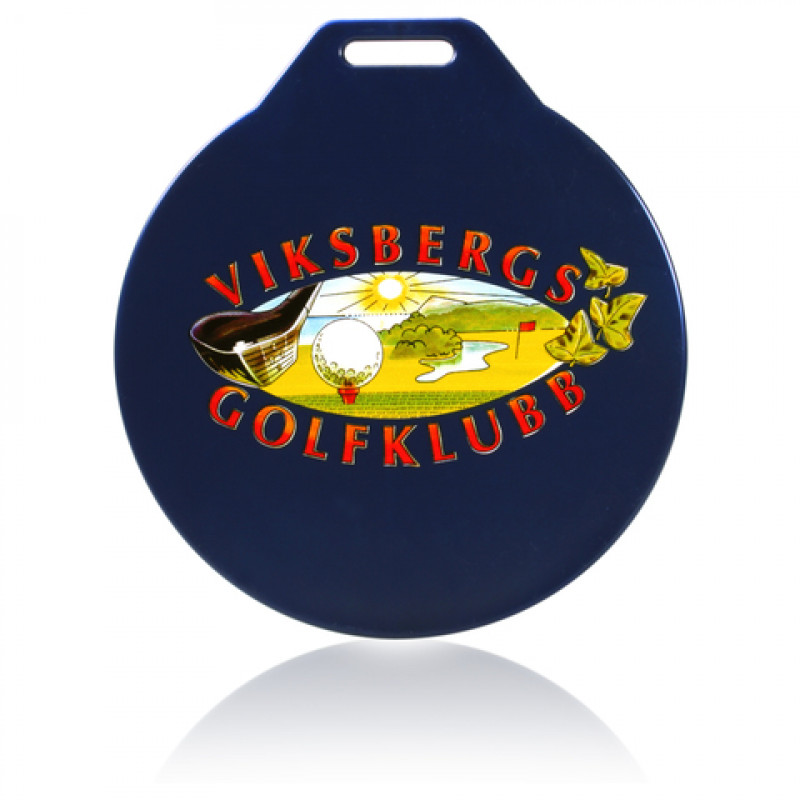 Vahvasta muovista valmistettu suuri pyöreä kyltti, jossa reikä hihnalle (ei sisälly, katso alla). Kyltin koko on Ø 100 mm, siinä riittää hyvin tilaa seuran logolle ja sponsorille. Mitat: Ø 100 mm. Max painoalue: Ø 90 mm.