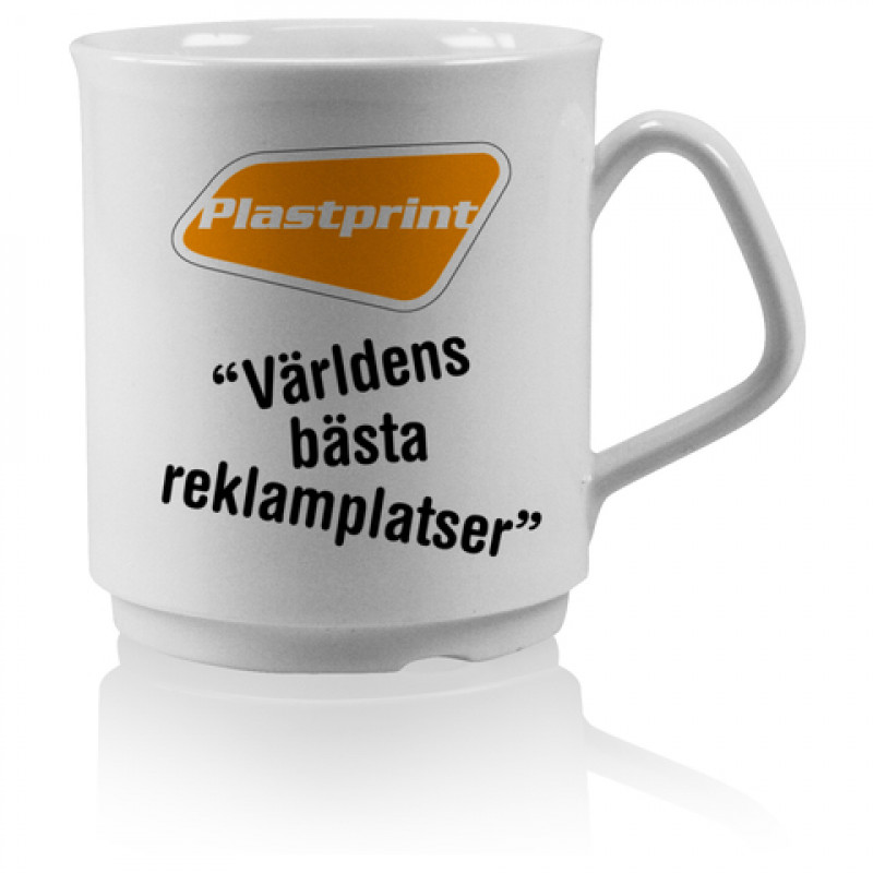 Yksi suosituimmista mukeista on nyt saatavana myös muovimukina, jossa on reilu tila painatukselle. 1ä2 värin painatus. Mitat: 30 cl. Korkeus 93 mm. Max painoalue: 170 x 60 mm.