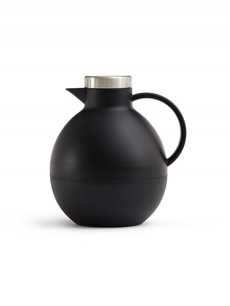 Pyöreä muovinen termoskannu, jossa metallikansi. Säilyttää hyvin lämmön sisäpuolen kaksinkertaisen lasin ansiosta. Kannu on yhtä aikaa ajaton ja moderni. Tilavuus 1 L. Pakattu lahjalaatikkoon.