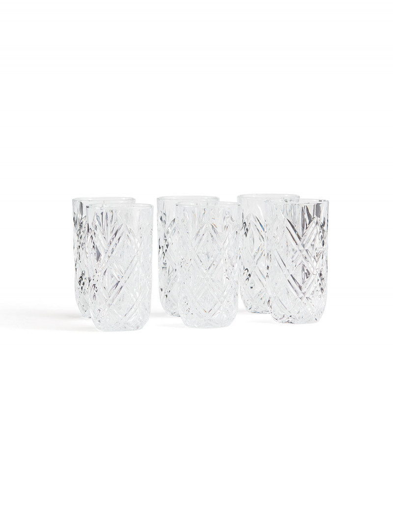 Kuusi trendikästä highball lasia. Hienot konepesun kestävät lasit juhlaan ja arkeen. Koko: 14x7 cm. Pakattu lahjalaatikkoon.